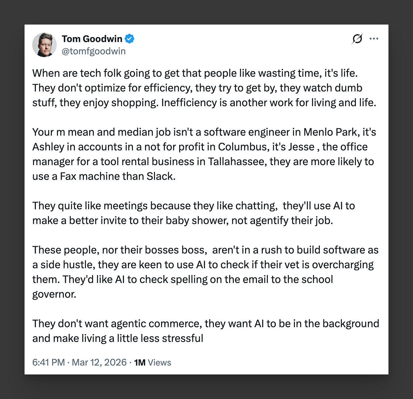 One of the best takes I’ve seen on AI. Humans just aren’t designed to make their life as efficient as possible.